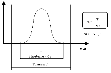 Der Index cp ist ein Maß für die Breite der Prozeßstreuung im Verhältnis zur Toleranzbreite. Als Breite der Prozeßstreuung wird üblicherweise die dreifache Standardabweichung nach oben oder unten um den Mittelwert verwendet (6-Sigma Bereich). Innerhalb dieses Bereiches werden bei einem beherrschten Prozeß mehr als 99% aller Werte erwartet. Ist diese Prozeßstreubreite gleich der Toleranzbreite (Oberer Grenzwert und Unterer Grenzwert) so ist der cp-Wert gerade 1. Bei einseitig tolerierten Merkmalen (z.B. Rundlauf) kann der cp-Wert nicht bestimmt werden, in diesem Fall wird nur mit dem cpk-Wert gearbeitet.
