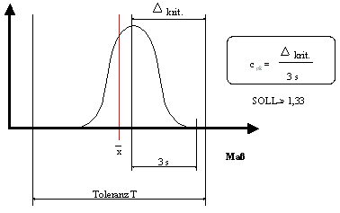 Der Index cpk berücksichtigt zusätzlich die Lage der Verteilung. Hierzu wird der kritische Abstand zwischen Prozeßlage und Toleranzgrenzen berechnet. Der cpk-Wert ist so definiert, daß er gleich dem cp-Wert ist, wenn der Prozeß in Toleranzmitte zentriert ist. Jede Abweichung von dieser zentralen Lage führt dazu, daß der cpk-Wert kleiner ist, als der cp-Wert.