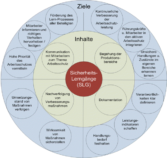 Die kontinuierliche Verbesserung der Sicherheit der Beschäftigten, wie sie beispielsweise im deutschen Leitfaden für Arbeitsschutzmanagementsysteme (AMS) hervorgehoben wird, ist eine stetige Herausforderung, die in allen AMS täglich angenommen wird. Einer der Grundpfeiler ist es, hierarchieübergreifend alle Unternehmensangehörigen zu motivieren, sich aktiv am präventiven Arbeitsschutz zu beteiligen und ein ausgeprägtes Sicherheitsbewusstsein im Verhalten der Angestellten zu verankern als auch in die täglichen Unternehmensabläufe zu integrieren. Um dies besonders in Bereichen mit hoher Unfallhäufigkeit, wie etwa der Produktion oder des technischen Services, zu erzielen, wurde im Mercedes-Benz Werk Berlin eine erweiterte Form von Bereichsbegehungen eingeführt: die Sicherheitslerngänge, kurz SLG. Sie unterscheiden sich von gewöhnlichen Sicherheitsbegehungen durch ihre Zusammensetzungen aus Fachkräften für Arbeitssicherheit, Vertretern des Betriebsrates, Mitarbeitern des werksärztlichen Dienstes, den Sicherheitsbeauftragten des Bereichs und den zuständigen Teamleitern sowie durch die regelmäßige Teilnahme höherer Führungskräfte bis hin zum Werksleiter. Auch Teamleiter und Meister aus anderen Bereichen sind ebenfalls eingeplante Teilnehmer, die durch ihren bereichsfremden Blick und Erfahrungen aus dem eigenem Bereich wertvolle Hinweise und Anregungen zur Verbesserung geben können. Ein weiterer entscheidender Unterschied zu herkömmlichen Sicherheitsbegehungen ist die inhaltliche Gestaltung dieser Rundgänge, die der Abbildung zu entnehmen ist, wobei die gewünschte Kommunikation zwischen Führungskräften und den Mitarbeiten hervorzuheben ist. Hierdurch wird nicht nur ein klares Zeichen durch die Führungskräfte in Sachen Arbeitsschutz gesetzt, sondern führt ebenfalls zu einer beidseitigen Ausbildung des Arbeitsschutzgedankens; sei es durch positives Hervorheben von sicherheitsgerechtem Verhalten der Mitarbeiter durch die Führungskräfte oder durch das Aufzeigen von Missständen durch die Mitarbeiter. Zu den weiteren Aufgaben der SLG zählt die Nachverfolgen bzw. Wirksamkeitsüberprüfung von Verbesserungsmaßnahmen, die im Rahmen von Gefährdungsbeurteilung oder SLG veranlasst wurden, als auch das Vorantreiben der präventiven Verbesserung des Arbeitsschutzes durch Erarbeitung von Vorbeugungs- und Korrekturmaßnahmen. Die SLG werden in einer mit den Bereichen festgelegten Anzahl durchgeführt, wobei eine Mindestanzahl von Teilnahmen je Teilnehmergruppe vorgegeben ist.