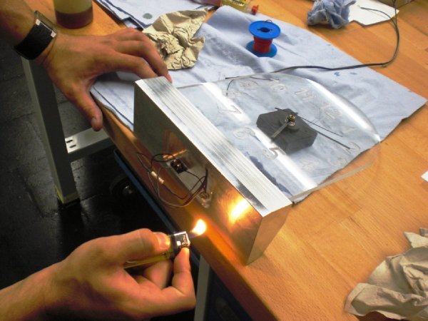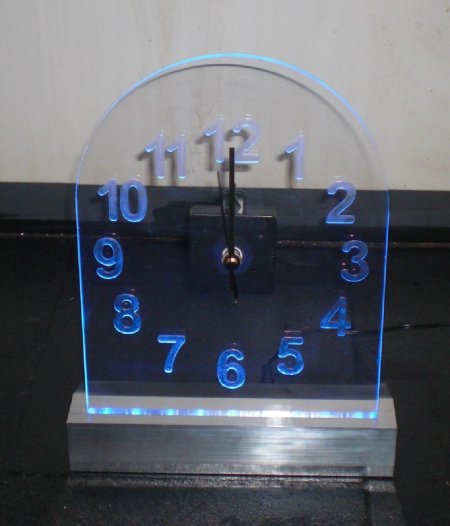 Besonders pfiffig ist die Beleuchtung der Uhr gelöst. Sie efolgt über LED-Lampen, die im Sockel (aus Aluminium) integriert sind und über das Plexiglas gekonnt an dem per Hochgeschwindigkeits-Fräsmaschine gestaltetem Zifferblatt "hängen bleibt".