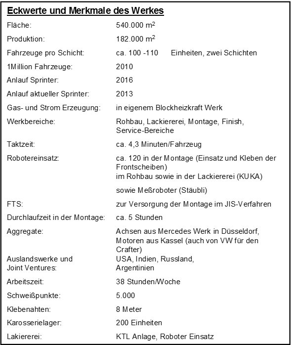 Vielen ist Berlin-Brandenburg aus dem Desaster um den Flughafen BER bekannt. Nicht weit davon entfernt gibt es ein stattliches Produktionswerk zu bestaunen, das seit Jahrzehnten Lkws produziert: Das Mercedes Werk für leichte Nutzfahrzeuge. Hier werden von ca. 1.800 Mitarbeitern die sehr erfolgreichen "Sprinter" Modelle produziert, ca. 48.000 Einheiten im Jahr, sogar welche für Volkswagen unter dem Namen "Crafter" mit leicht veränderten Design.