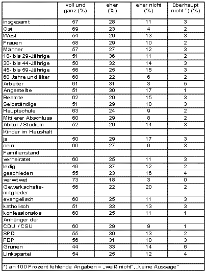Der Aussage, dass den Schülerinnen und Schülern in Deutschland mehr Disziplin gut tun würde, stimmt die Mehrheit der Bevölkerung "voll und ganz" oder zumindest "eher" zu (85%). Zusammen nur 14% sind dagegen der Meinung, dass dies "eher nicht" oder "überhaupt nicht" der Fall ist. Was sich so klar und eindeutig anhört, ist umstritten. Erziehungs-Wissenschaftler sehen in der Disziplin-Forderung den Versuch, selbständiges, kritisches Denken und Handeln zu begrenzen. Sie fordern den Bezug zwischen Disziplin und Werten. Auch in der Industrie darf nicht dröge Disziplin verlangt werden. "Diszipliniert die Produktivität erhöhen, um dann arbeitslos zu sein"? War eine der kritischen Meinungen. Eine andere: "Wir (Arbeiter) sind diszipliniert, schauen Sie sich aber kritisch unsere Führungskräfte an, einige von ihnen würden sofort durch einen Disziplintest fallen". Was die Jugendlichen anbelangt: Unser Nachwuchs braucht Zukunftsperspektiven. Allein die Diskussion um die Rente ("die Rente ist sicher" / Arbeitsminister Blüm), erzeugt im besten Fall unter den 20-Jährigen einen Lacher.