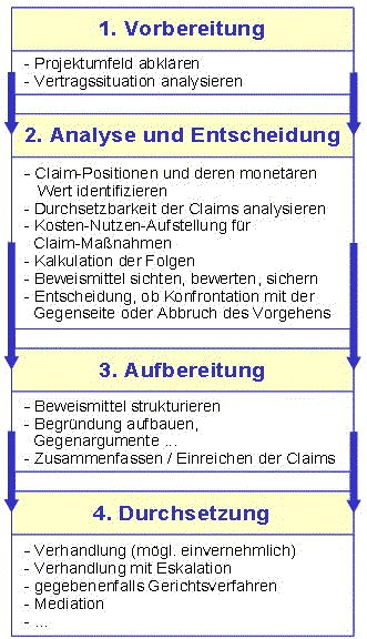 Der im folgenden beispielhaft skizzierte (unvollständige) Ablauf zum Umgang mit Claim-Situationen gilt sowohl für die Behandlung (Abwehr) gegnerischer Claims als auch zur Behandlung (Durchsetzung) eigener Claims.