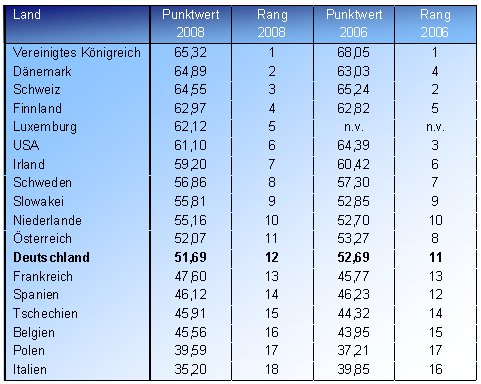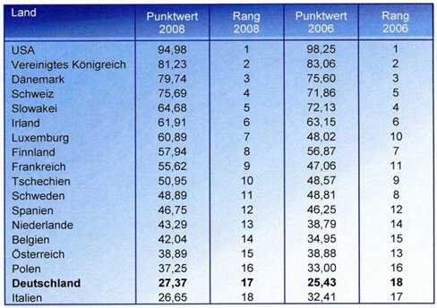 Gut schneidet der Standort Deutschland im Bereich der Finanzierung (Rang 5) und sehr gut im Index Infrastruktur (Rang 4) ab. "Das stabile rechtlich-institutionelle Umfeld und die hohe Qualität der unternehmensnahen Infrastruktur gilt es weiter zu stärken, denn hier liegen die positiven Effekte für den Gesamtindex", mahnt Heinemann und verweist auf die rasante dynamische Entwicklung von benachbarten Ländern wie beispielsweise die Slowakische Republik.