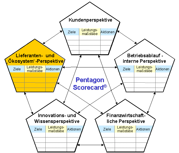 Ein weltweit erfolgreiches Konzept der ganzheitlichen Unternehmensführung haben in den USA Norton und Kaplan mit ihrer Balanced Scorecard (BSC) entwickelt und vermarktet. Es gibt eine selektive Überlappung zwischen der Forschungskonzeption des Autors und der der o.g. amerikanischen Forscher und Berater. Unterschiede: Zielrichtung von Pentagon ist auf die Produktion im Netzwerk fokussiert, während das BSC-Konzept auf das gesamte Unternehmen zielt. In früher durchgeführten Forschungsarbeiten zu der BSC wurde eine fehlende Perspektive (die der Lieferanten-Einbindung) festgestellt, also die fünfte Perspektive, daher auch der Name der ergänzten wissenschaftlichen Methode Pentagon Scorecard.