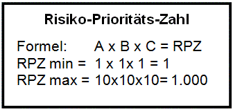 1. Festlegen der Risikoprioritätszahl für jedes (potentielle) Ersatzteil nach der Formel: Auswirkung x Häufigkeit x Wahrscheinlichkeit = Risiko RPZ.