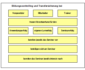 Die Zielerreichung der einzelnen Bildungsmaßnahmen benötigt eine Kontrolle des Lernerfolgs. Jede Lernerfolgskontrolle muss sich an den Lernzielen orientieren. Die lernzielorientierten Messinstrumente müssen schon bei der Planung erstellt werden. Der Lernerfolg wird nach folgenden Fragen geprüft: